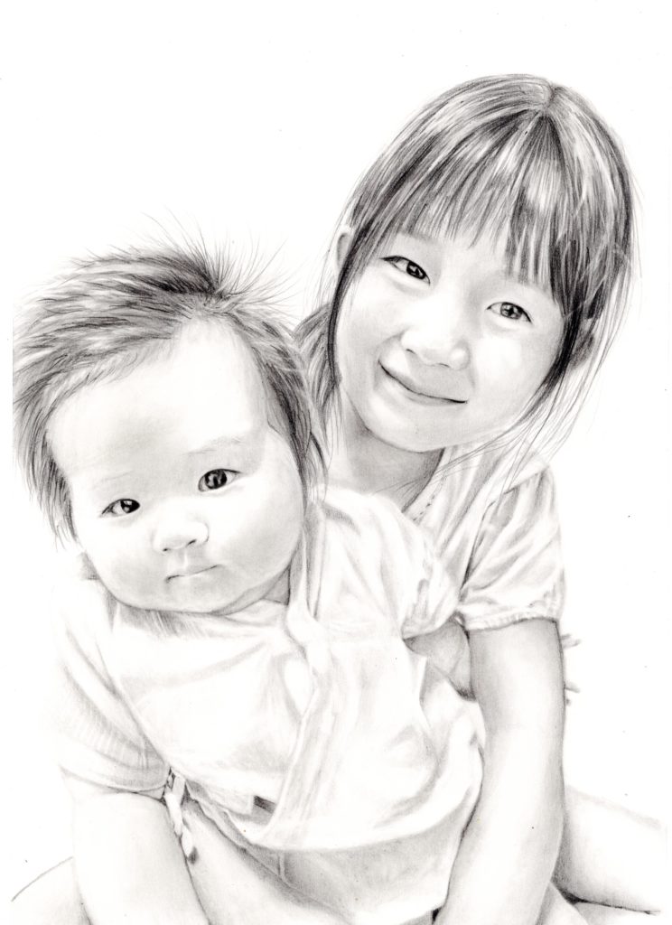 | 鉛筆画 お孫さんを描いてほしいというご依頼でした。 お子さんのもっちりとしたつや肌を表現するために薄めの鉛筆で仕上げました。 お二人分のお値段と、首から下までのオプション料金をいただいております。 |